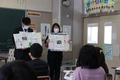 4年生は、2学期に美山病院の方々に手紙を贈りました。その御礼として1月25日(水)美山病院の代表の方々が本校を訪れてくださいました。また,さらに交流が広がり,4年生の冬休みの作品を美山病院で数週間展示していただくことになりました。地域の福祉施設とのこのような心温まる交流をこれからも大切にしていきたいです。