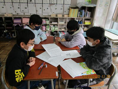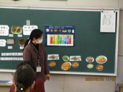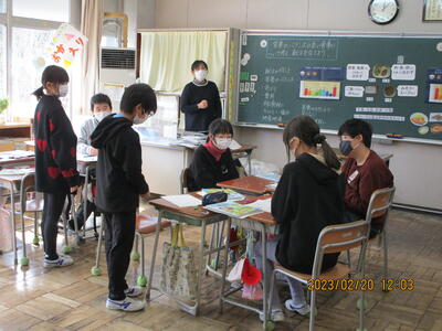 2月20日、真城学校給食センターの栄養教諭の先生を講師に6年生を対象にした食育指導が行われました。栄養バランスのよい食事とはどのような食事なのか子ども達はグループで話し合い、1食分の献立を考えることができました。